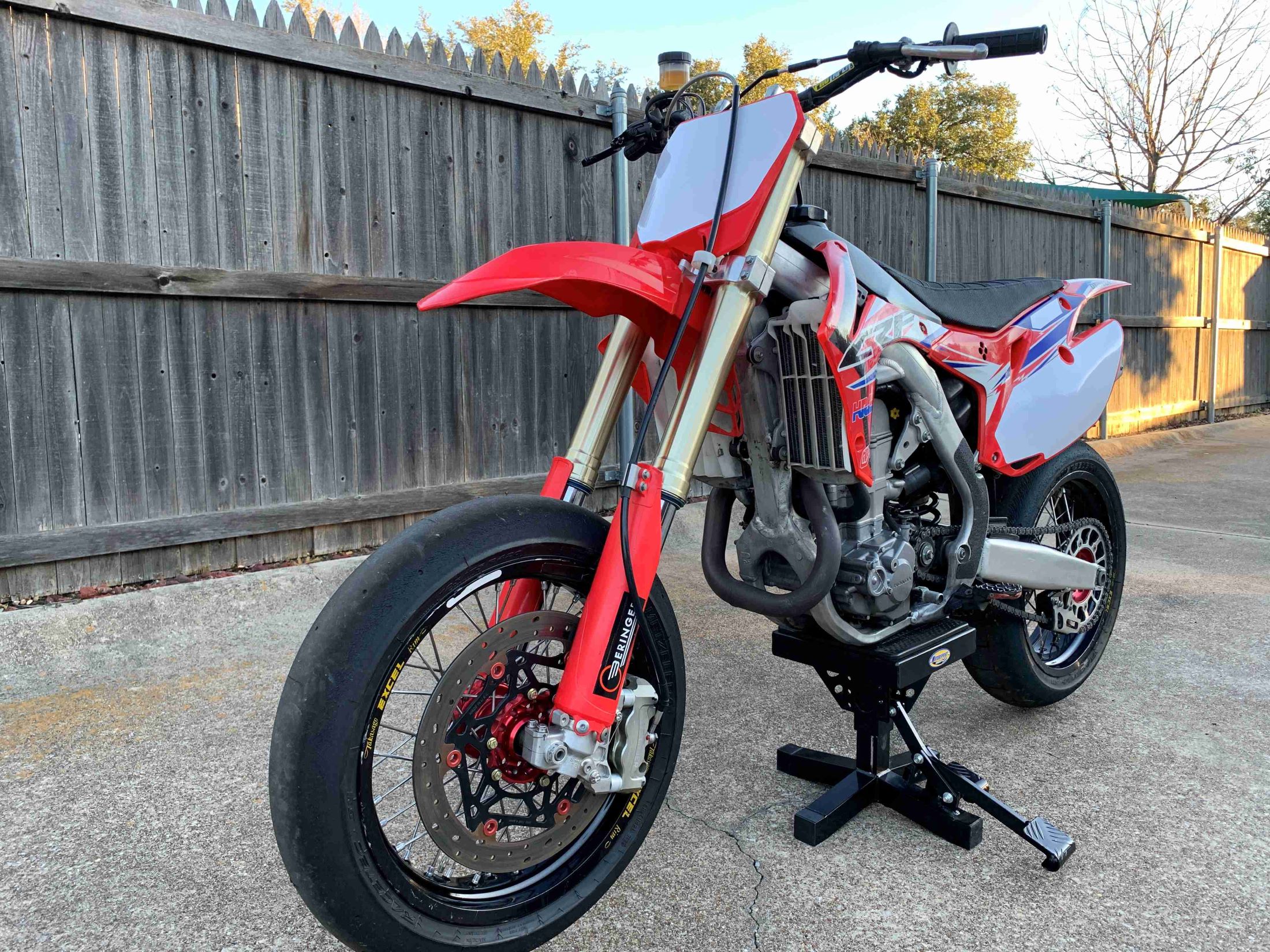 For sale is a 2013 Honda CRF450R set up for road race and/or supermoto track use. This is the first year with fuel injection, and it runs very strong. The wheels are black Takasago Excel rims laced to red Talon hubs, with a 16.5” (420mm) x 3.50” wide front and a 17” x 5.00” wide rear. A good set of Metzeler Racetec slicks are currently mounted, and this package comes with a brand new set of Metzeler slicks that have been stored in conditioned space.