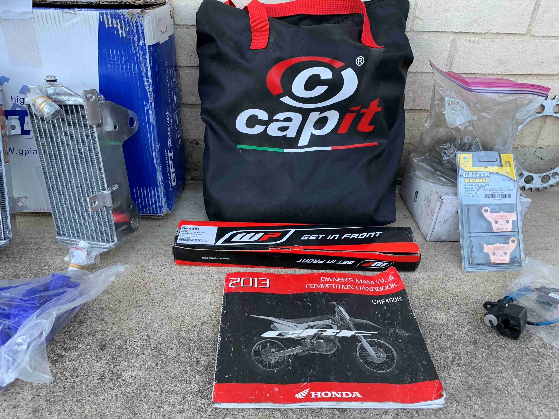 This well maintained bike comes with a brand new set of CapIt brand tire warmers, the race/service stand, a brand new replacement radiator with hoses, alternate gearing, spare brake pads, stock clutch, a WP air pump for the forks, and the Honda OEM service/competition manual.